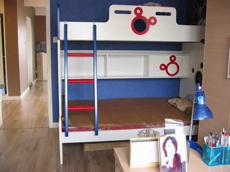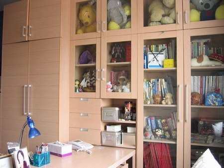 自己设计的书柜和书桌,因为考虑到以后是儿童房,所以书柜边上还有一个衣柜