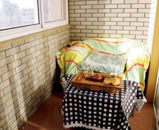 用砖块壁纸铺贴阳台墙面,布置一个单人位小沙发、一个小茶几,阳台仿佛变成一个独立的小茶房。阳光微微透进来,躺着品茶该是多么惬意。