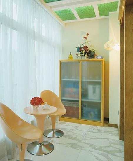 小户型空间有限,收纳必须无处不在,阳台也是收纳的好空间。玻璃门的收纳柜让各种物品井井有条,而且找起来很方便。准备两个高脚凳加一个高脚小圆桌,既不占地方,又是休息谈话的好去处。