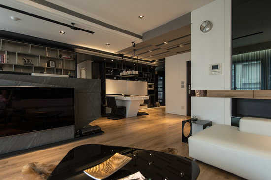 编辑点评:结合石材、木纹、皮革等材质,并透过天花板的黑镜反射,顺势放大空间的视觉效果。