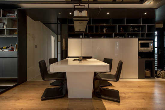 编辑点评:餐柜的用色和书房形成阴阳概念,衍生出专属彼此的空间。地面的深浅转换,让空间的不同属性立马展现。