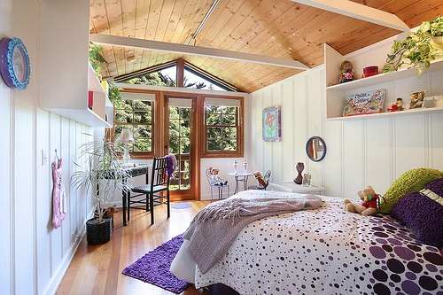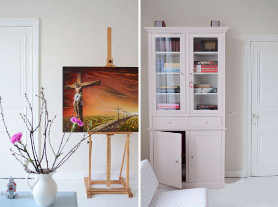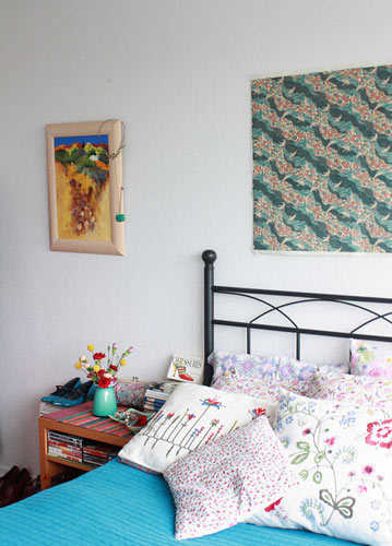 由于布料很轻,屋主选得收纳柜比较简陋,柜上挂着的手包就是屋主的作品。由于收纳柜较高,放张垫脚的椅子很是必要,记得要选择稳固一点的椅子哦。过于凌乱的部分,就拿块布挡着。