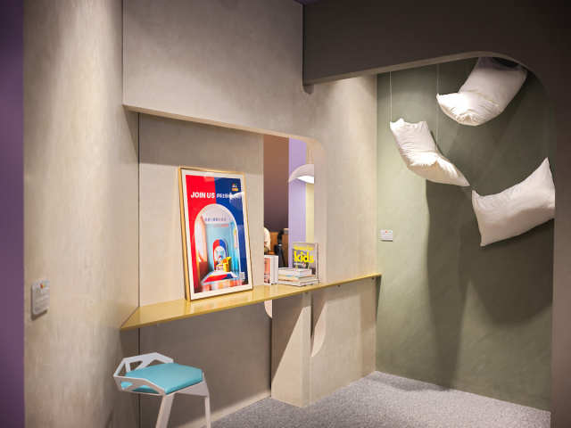 “时光的房间”是一个紫色和黄色互补色交织的景箱设计,层层叠叠的阶梯,配合大胆的撞色设计,仿佛时间在这一刻,因色彩而停留。