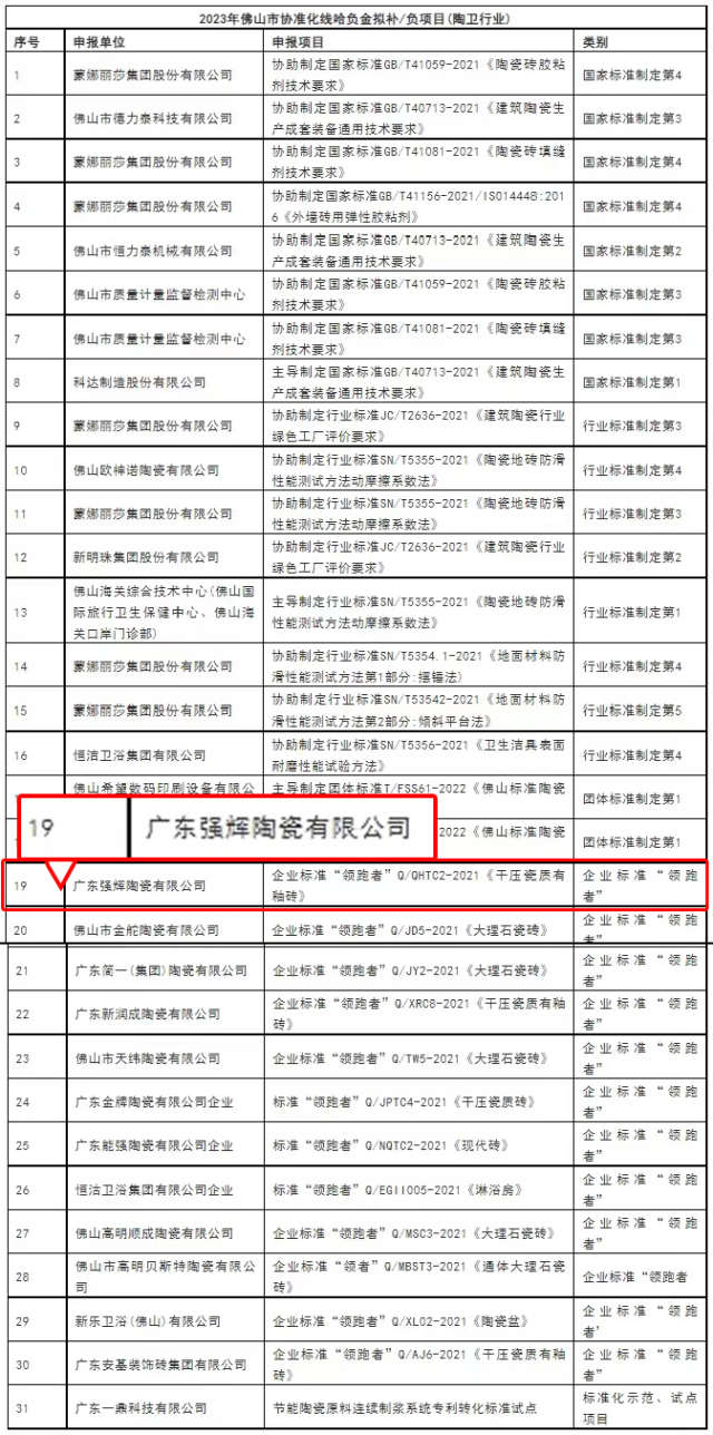 近期,广东佛山、广西等多地均发布了对企业做出表彰的榜单,其中,有多家陶企凭借技术创新、品牌建设、质量管理等方面的举措,成功入围。5月29日,2023年佛山市标准化战略资金拟补助/资助项目公示,广东强辉陶瓷有限公司上榜。
