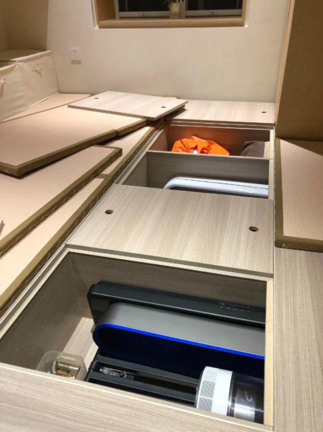 抬高的榻榻米下也是收纳空间,一些不常用的大物件就可以收纳在这里,木板与榻榻米双重加固,保证了牢固性,在上面走动玩闹也丝毫不会有影响。