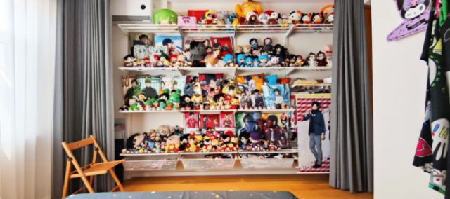 电视柜打开以后是琳琅满目的小物件,各种喜欢的杯子、纪念餐具,星爸爸、Godiva、学校毕业礼......还有日本KFC每年圣诞节限定的杯子和盘子!就连卧室的窗帘背后,也设计成囤放各种漫画周边的地方。被自己的热爱所包围的感觉真好。