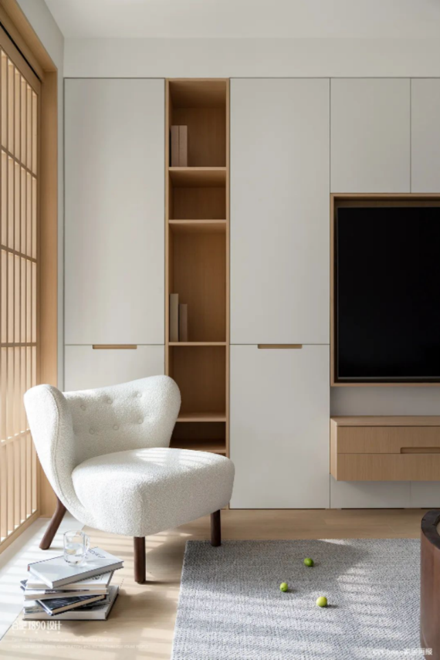 而整个电视背景墙则是一个完整的收纳柜系统,柜体采用内嵌式无把手设计,不仅使用方便,外观也更简洁美观。大容量的收纳,一家人的生活杂物都可收纳其中,柜门一关,整洁划一。(电视也采用内嵌式,与柜平面保持一致。)