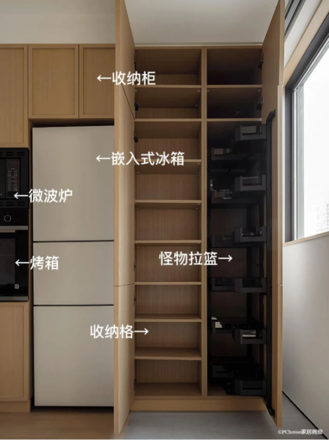 旁边餐厅和西厨区域内嵌了一个冰箱,方便日常饮料、酒水、茶叶的拿取和冷藏,上面预留空格用于散热,既实用又美观。旁边还设计了一组层板柜和一组怪物拉篮,可以作为零食柜使用。
