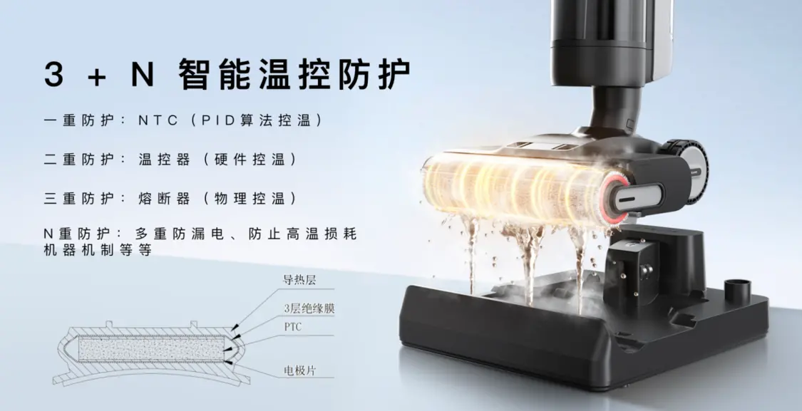 一方面采用了智能温控系统,通过NTC采样实时温度,来确保使用时的温度稳定可控;另一方面配备了硬件温控器,如遇到NTC防护失效,温度过高时,PTC内置的温控器会自行断开,达到降温的效果。若NTC和温控器长期使用,超过使用的时间和寿命时,追觅H30搭载的智能温控防护配置会采用熔断器物理控温的方式,来保障用户的使用安全;