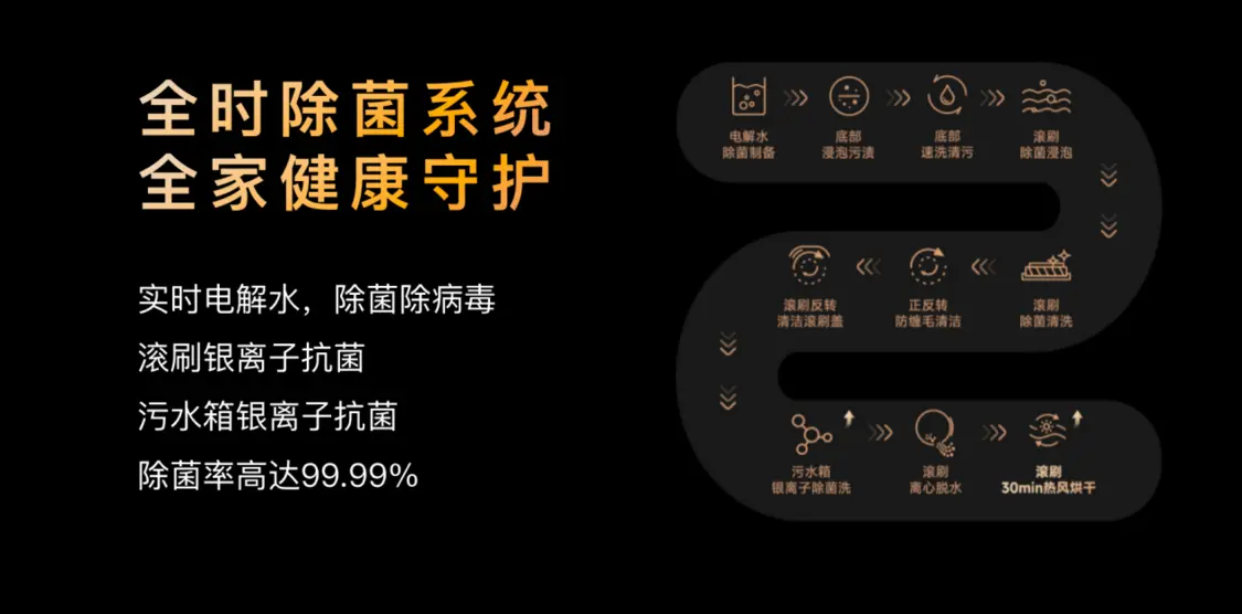 为进一步提升消费者健康体验,追觅H30采用“电解水+银离子+热水洗滚刷+热风烘干”全链路除菌功能:一键生成除菌电解水,电解水流经的部件包含清水箱,并在底座进行加温至60℃,利用高温热水高速清洗滚刷和管路,并最后快速烘干滚刷,高效率完成自清洁,将除菌率拉升至99.99%。此外,污水箱的材质中还注塑了银离子,有效抗菌不发臭、效果更持久。同时,滚刷采用了超声波雾化技术,将银离子抗菌剂均匀地渗透到滚刷绒布表面,更有效地抗菌防异味。对于家中有小孩、宠物,喜欢光脚踩地板的情况也能做到更好的防护。