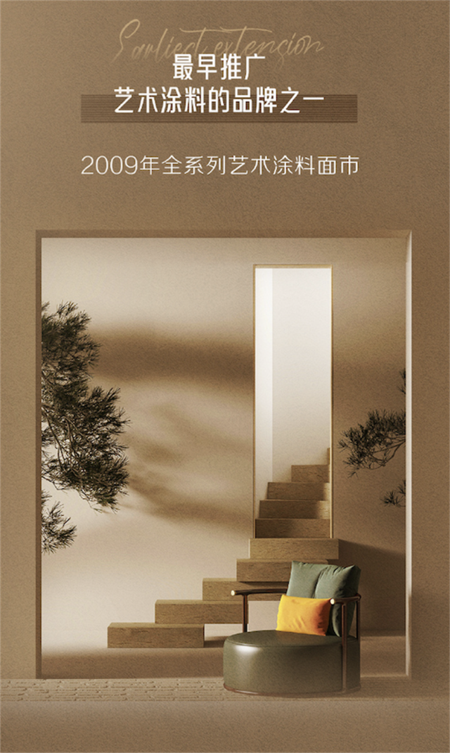 基于对市场趋势的敏锐洞察和前瞻性布局,嘉宝莉早于2004年便开始自主研发艺术质感涂料,2008年首创3D质彩漆,2009年率先正式进军艺术涂料领域,并推出以“雅晶石”为代表的全系列艺术涂料产品。