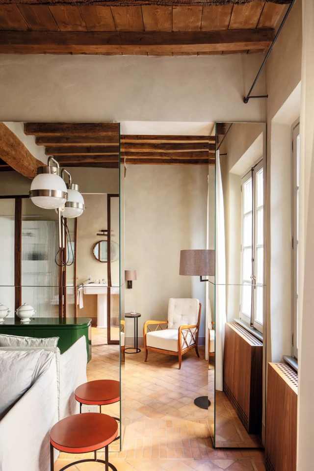 在套房内,Eligo Studio 设计了一个带有镜子的衣柜,将卧室与客厅分隔。Delta 壁灯由 Sergio Mazza 于 20世纪60 年代设计(Artemide 出品)。Ghost 沙发由 Paola Navone 设计(Gervasoni 1882 出品)。复古扶手椅由 Paolo Buffa 设计。