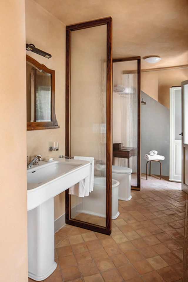 借助条纹玻璃隔断、陶土方砖地板和粉刷墙壁,浴室与卧室遥相呼应。