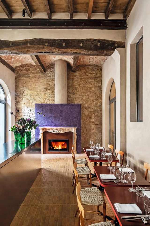 在改造空间方面则保留了可以保留的一切,包括楼梯、地板、墙壁和横梁。然而,他们毫不犹豫地在地面铺设了陶土方砖,并粉饰了墙壁。Alberto Nespoli 在选择色彩时总是信任他的合作伙伴,此处的颜色并非鲜亮的色调,但 餐厅壁炉周围的紫色灰泥板除外。接手这家餐厅的年轻厨师负责提供美味的当地菜肴,但略微进行了改造。这就是 Eligo Studio,总是准备好重新审视传统,从其“田园”风格的座椅中就可窥探一二。