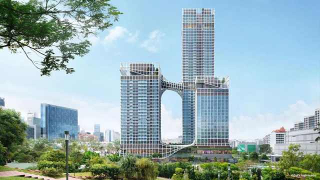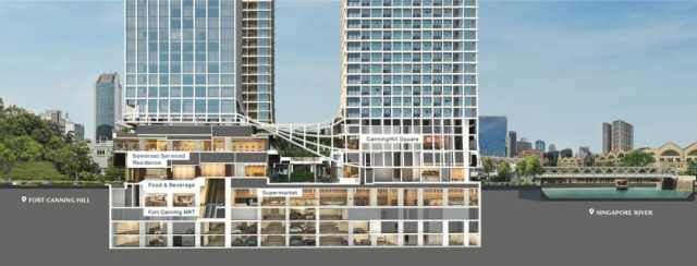 CanningHill Piers(康宁河湾)由凯德集团与城市发展集团携手开发,BIG应邀设计了四座错落有致的高层塔楼——两座对角并置的高层住宅,两座酒店式服务公寓,其中公寓底部两层为商业区。四座高楼间设有一定的距离,视野开阔,即使是在商业底座中心的庭院中也能够欣赏到天空。两座高层住宅楼共有696套住宅,且于24层建有一座连接两幢楼的天桥,提供了多种生活方式。其中,24层、高100米的楼盘毗邻福康宁山,而48层、180米高的临河楼盘则将成为新加坡河畔最高的住宅项目。