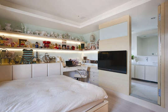 编辑点评:设计师将搁板和橱柜相结合的灵活设计,既节省空间又增强收纳。而隔板上的一件件摆设物品无形中美化了墙壁,提升了空间的展示功能和整体格调。凌乱而不失观赏性。
