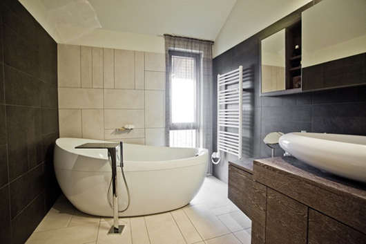 编辑点评:上下一体的洗漱台设计,储物柜与隔板完美结合,尽显空间的灵活性和收纳功能。而将镜子作为柜子的表面,既延展空间,增加空间的光线,又装饰了柜子。完全呈现现代装饰风格,实现多用空间。