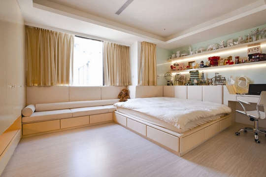 编辑点评:架空的书桌,巧妙利用起空间死角,让空间质感更加轻盈。低矮的床头柜实用大方,增强空间的收纳能力,一左一右,一高一低,无形中增添了空间的层次美。整体显得简洁、艺术有个性。