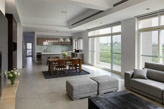 编辑点评:从玄关进入室内,客厅、餐厅与厨房位于开放的平行面上,耀眼的日光带入远山绿意与荒地近景。