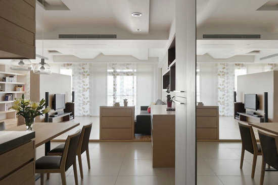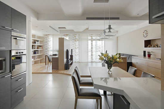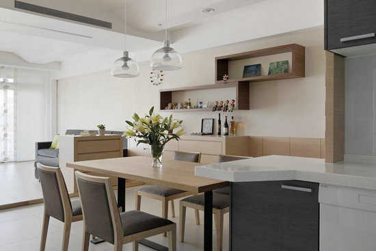 编辑点评:延续流转的波纹线条往后延伸至餐厨区,连接起完整的空间。设计师利用梁下的空间规划错落线条层架,层次中打造简约风格。