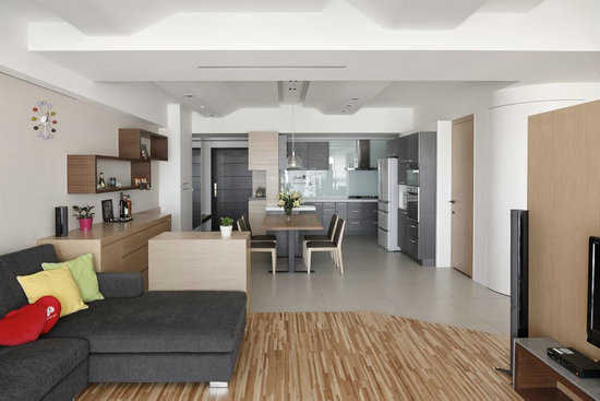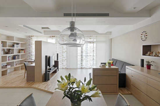 编辑点评:设计师在原有客卫浴处增设半径高达90cm的1/4圆弧大容量储藏室,其墙面线条也导引出流畅的居室风格。
