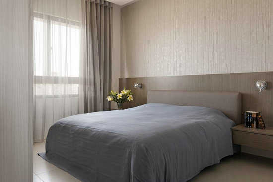 编辑点评:浅色立体壁纸与深色木皮墙面,深浅对比出沉静的睡眠氛围。