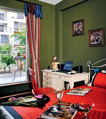 次卧用沉稳的墨绿色为墙,配以大红的床单,雪白的书桌,另有一种低调的奢华。