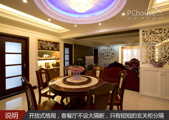 点评:为了突显打通后户型的奢华之感,在诺大的空间中使用开放式设计,把客餐厅融为一体。客厅一侧以玄关柜作隔断,上方是镂空设计增加通透感,下方是封闭收纳式,增加实用性。