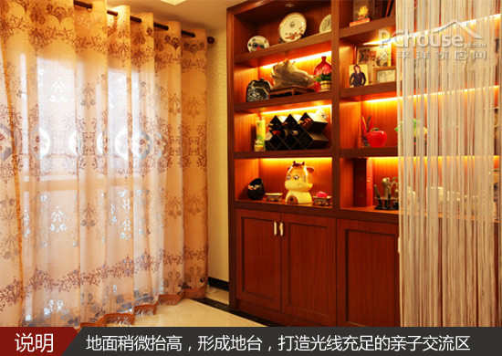 点评:拉开流苏隔帘,地台空间立现,吊顶依然采用上凹造型+水晶灯设计,散发欧式奢华气派;另外,靠墙而设的展示柜以暗红色实木搁板堆砌,加以灯带照明,营造出亮眼的华丽风格。上方展示,结合下方收纳,美观与实用并存。