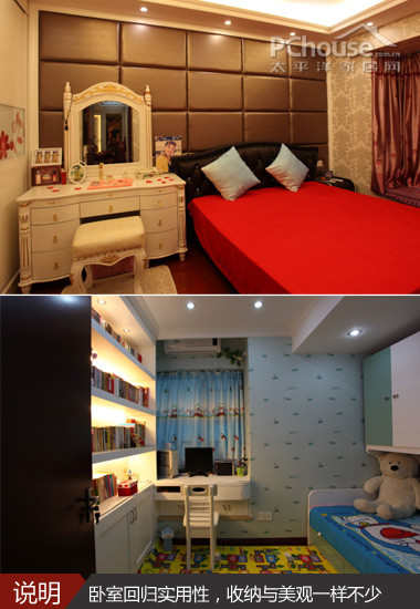 点评:细心地观察还会发现,主卧的衣柜点缀着古典元素。带蔓藤的红花图案,沿着柜门中间带成一字型铺开,让简单的白色柜面增添了不少丰富色彩。