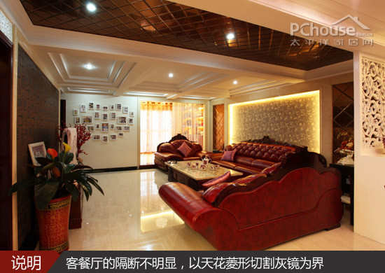 点评:客餐厅隔断处,吊顶是一面菱形切割的灰镜,用以增大空间,又区分了客餐厅版块,镜面从天花延伸至客厅背景墙,有一气呵成之感。另外,隔断处恰好是玄关柜,柜的上方是镂空雕花图案,跳动着浪漫元素,让整个空间的欧式风格更多样化。