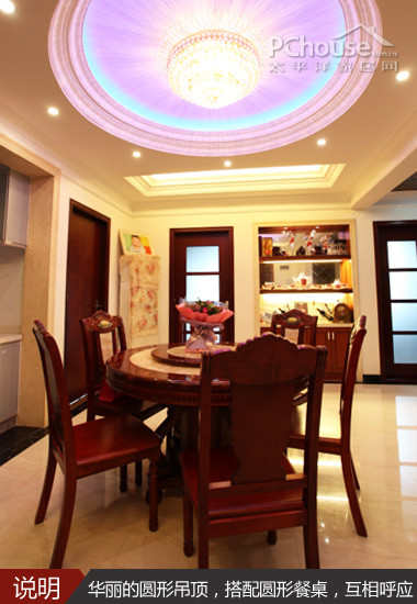 点评:进入餐厅,圆形上凹吊顶内嵌吸顶水晶灯,散发的光环绕吊顶周围,欧式气派再现。与客厅成系列的暗红色实木餐桌也是圆形,与吊顶相互呼应,整体空间宽敞,适合大家庭多人用餐。