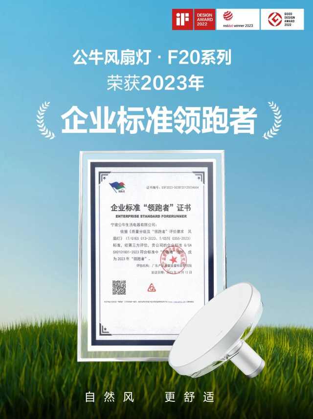 近日,广东产品质量监督检验研究院发布了2023企业标准领跑者的公示名单,公牛F20系列风扇灯更是凭借着领跑同类产品的质量水平以及高标准要求,荣获了「2023企业标准领跑者」称号,力争做好企业标杆。