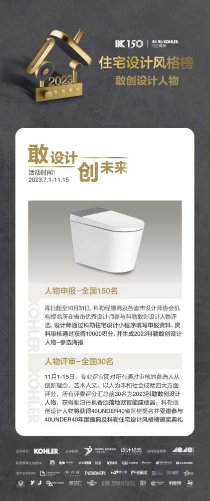 在科勒150周年之际,新一届的赛事还将评选科勒风格榜年度设计人物(KOHLER China Design 150),挖掘150位优秀的青年设计师代表,加持IP塑造,赋能新生力量加速成长,成为未来设计行业的趋势人物。