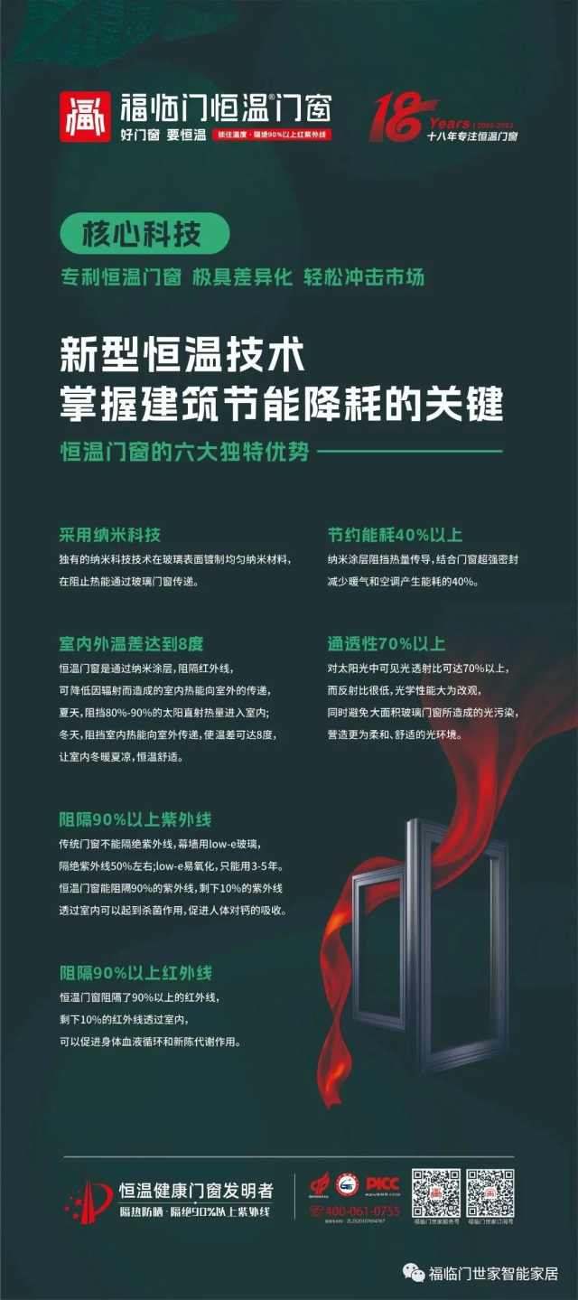 福临门世家恒温健康门窗——集福临门世家制窗工艺的大成之作,在原有断桥铝门窗研发制造基础上,进一步升级产品技术,创新窗户品类,并通过国家专利局审查,荣获国家发明专利!