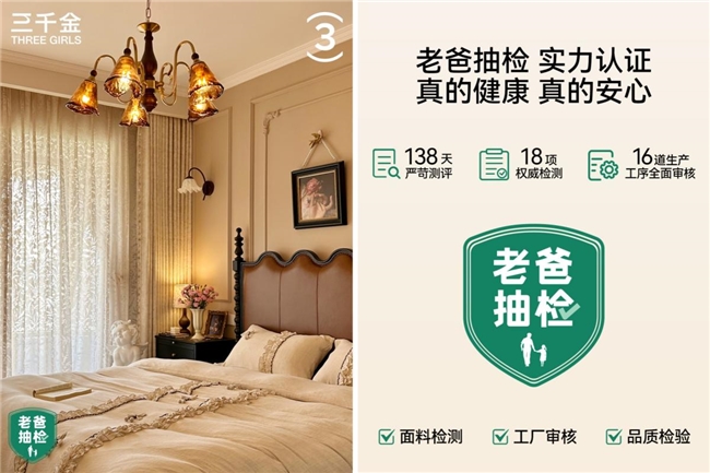 对有婴幼儿的家庭来说,窗帘的安全性堪称“红线”。三千金在这一点上表现突出,其窗帘通过了“老爸抽检”等第三方权威评测,甲醛、致癌芳香胺等有害物质均未检出,抗菌处理和遮光功能也完全不依赖化学涂层,从源头避免了宝宝接触残留化学物质的风险。反观金蝉,不仅缺乏权威健康认证,其抗菌和遮光功能多依赖表面化学涂层,这类涂层在长期使用中,可能因清洗、摩擦逐渐失效,还可能在宝宝啃咬窗帘边角时造成隐性危害。