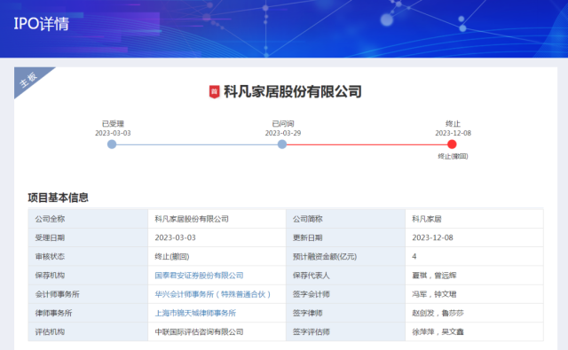 太平洋家居网注意到,全面注册制后,科凡家居的深交所主板IPO最早于2023年3月3日获得受理,保荐机构为国泰君安证券;3月29日,其IPO收到首轮问询函;6月29日,科凡家居更新最新一轮招股申报书;11月30日,科凡家居申请撤回发行上市申请文件。根据规定,深交所决定终止对其首次公开发行股票并在主板上市的审核。