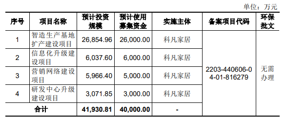 据此前招股书,科凡家居原拟在深交所主板首次公开发行不超过1667万股人民币普通股,占发行后总股本的比例不低于25%。公司原拟募资4亿元,用于智造生产基地扩产建设项目、信息化升级建设项目、营销网络建设项目、研发中心升级建设项目。