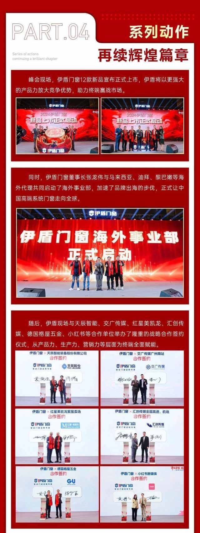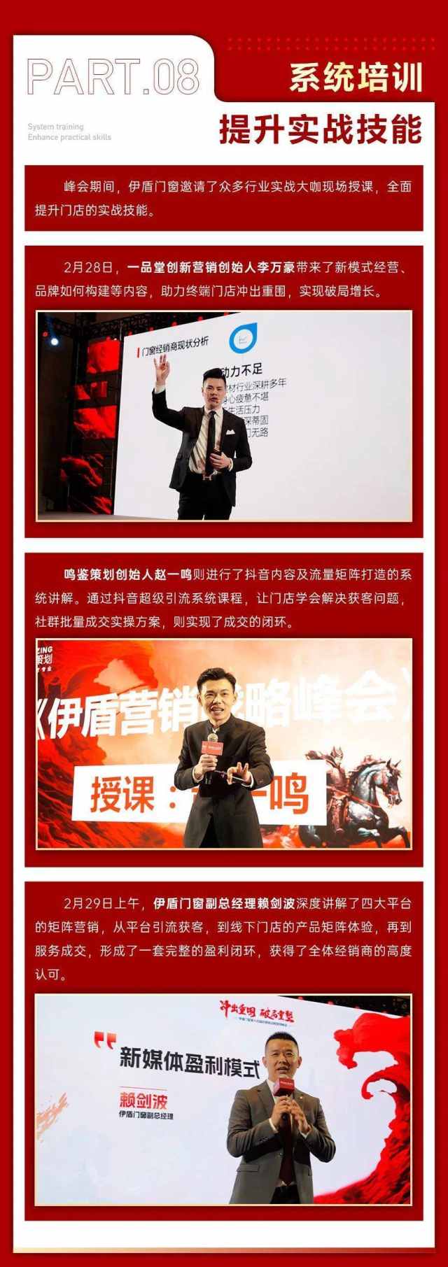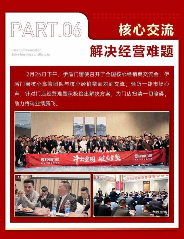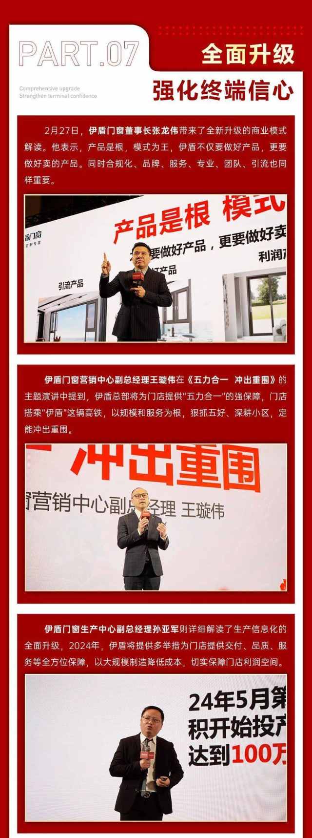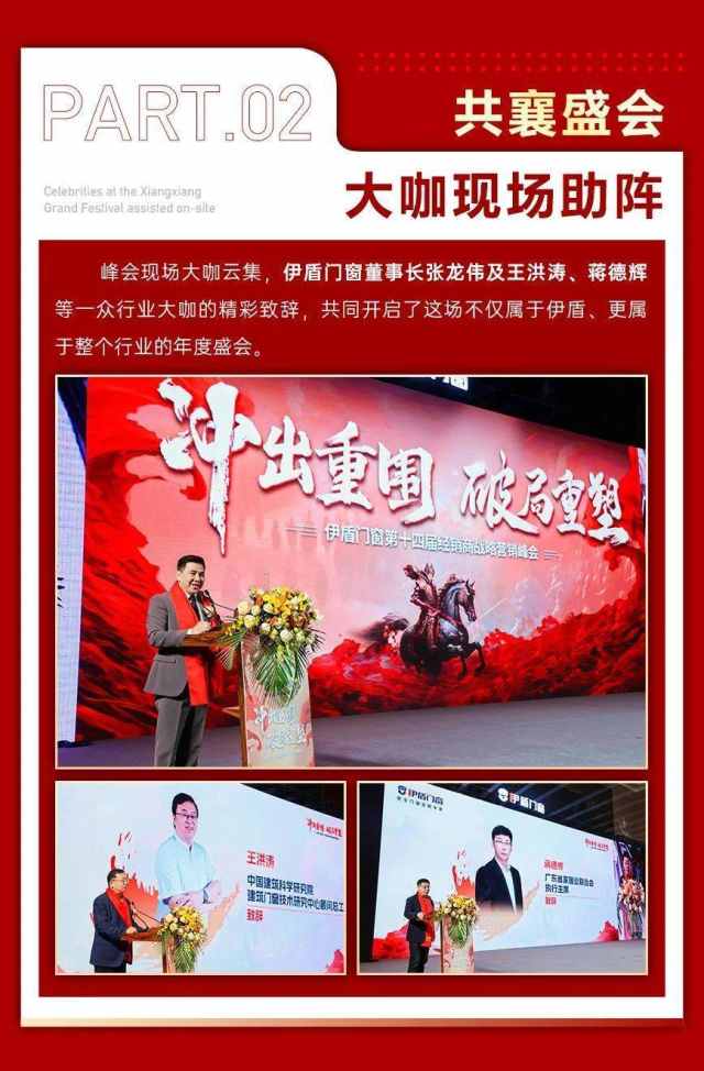 2月29日下午,中国建筑科学研究院建筑门窗技术研究中心顾问总工王洪涛、广东省家居业联合会执行主席蒋德辉、佛山市家居产业联合会执行秘书长杨志华、石川设计事务所创始人石川、中居文化高级合伙人叶玲菊、红星美凯龙门窗地板事业部总经理王一瑞、服务到家总经理孙源、广东省门业协会执行会长徐生、广东省定制家居协会秘书长曾勇、广东省门窗协会秘书长管琪林、泛家居圈创始人周忠等重磅来宾及伊盾门窗董事长张龙伟、总经理袁南京、副总经理赖剑波等核心管理层、媒体朋友、伊盾全国经销商、供应商出席盛会,现场高朋满座、群贤毕至,共同谋求2024破局之道,共同探索逆势增长之机。
