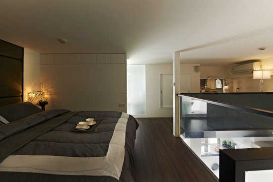 编辑点评:床上压梁的问题,设计团队以弧形结合壁纸化解疑虑,并极力争取衣物的收纳机能。