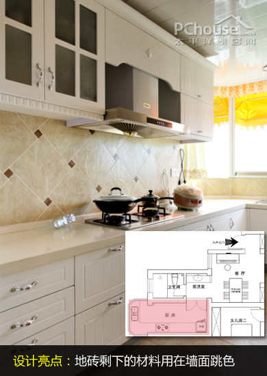 分析:设计师告诉我们这里有一个小秘密,就是墙面上的深色跳色砖,这并不是设计之初设想好的,而是地面的砖加工后,刚好多了半片,经过设计师的巧思利用起来了,造出了预想期并没有的立面效果。