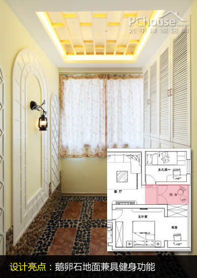 分析:阳台被主卧借用一半后,剩下的空间也足够生活之用。除了晾晒衣服之用,设计师还为这一家子打造了健身休闲区,地面铺满鹅卵石,随时都可以在上面按摩脚底。