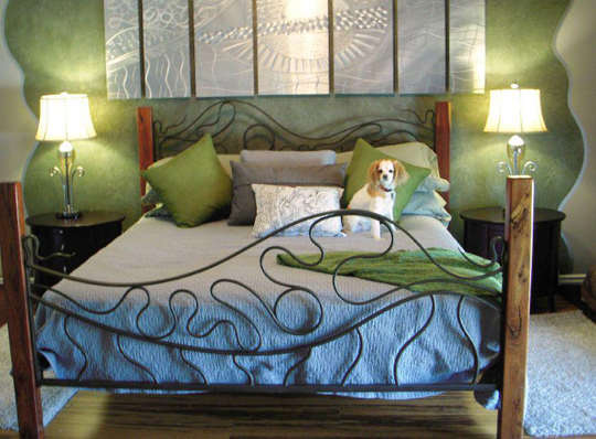 编辑点评:绿色的被褥、背景墙搭配木质的床、地板,完美融合,净添自然风味。背景墙波浪线的图案与床的线条设计交相辉映,打造柔美的空间效果,又有柔化空间的功效。