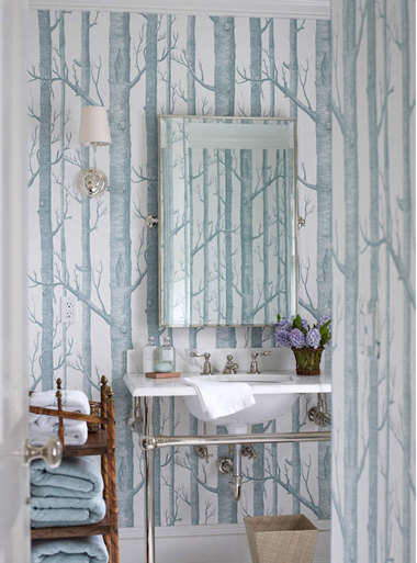 编辑点评:设计师使用树枝图案的壁纸打造墙壁,用壁灯、镜子、隔板、挂杆装饰墙壁的空白处,营造整体的空间感,还体现了空间的收纳展示功能。