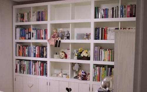 原来的书架只是单调的格子型设计,比较杂乱无章,而且置物层比较薄,放重一点就会向下弯曲变形。格子也比较小,柜子不高,但有7层。现在将横向的置物层加厚,书柜也比较耐用,而且将原来的7层变成6层,增加置物层的高度。再用白色的设计让房间充满童话的味道。