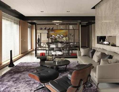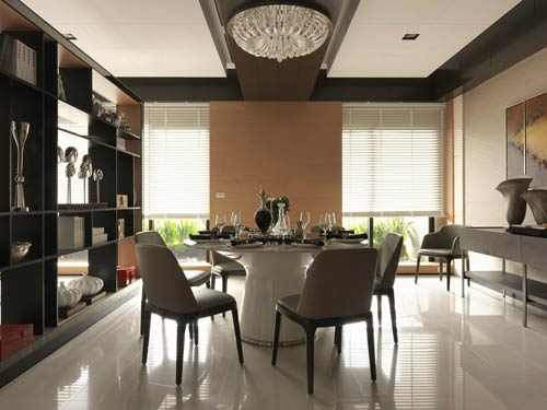 编辑点评:缕空穿透式屏风分隔客餐厅,亦可作为艺术品展示区。