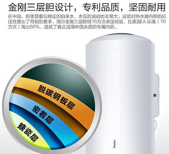 在中国,即使看似稳定的自来水,水压的波动也非常大。这就对热水器内胆的抗压性提出的苛刻的要求。海尔金刚三层胆经16万次承压检验,比美国UL标准高出60%,早就了真正适用中国水质的专属内胆。、
