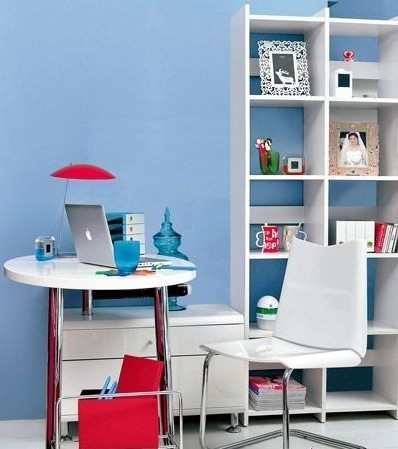 书房别致的设计会让人心情大好,在这个案例中,吊柜的设计十分新颖,浅蓝和白色相搭配,具有很好的装饰效果,是书房的吸睛品。