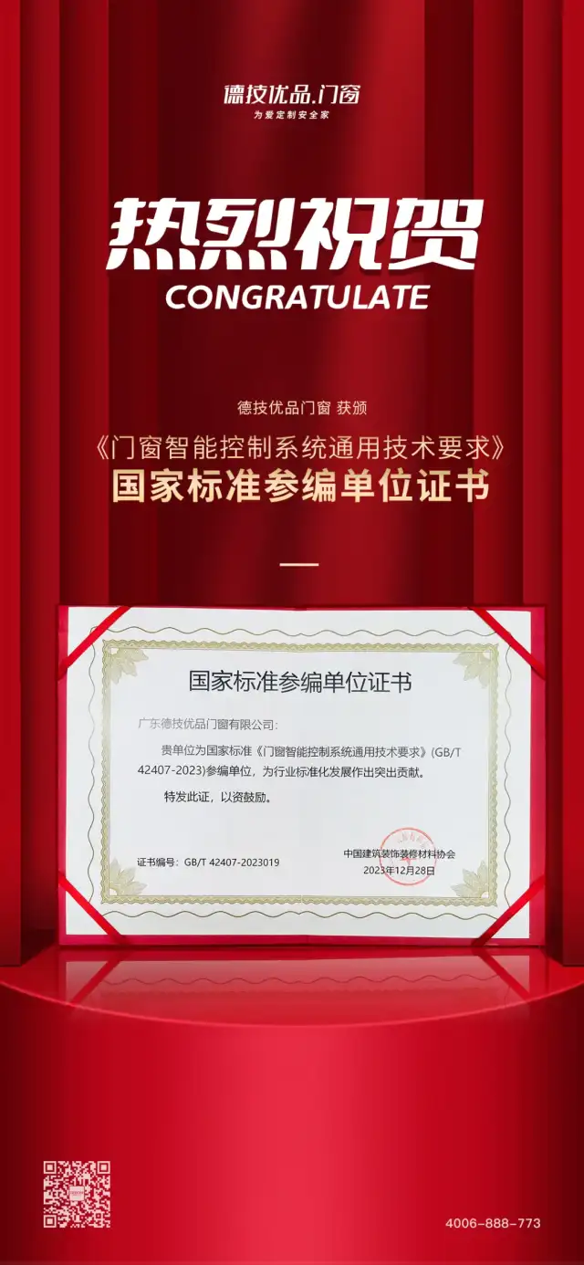 近期,德技优品门窗更是迎来了门窗行业有关智能化发展的两大重要荣誉,由中国建筑装饰装修材料协会颁发国家标准参编单位证书《门窗智能控制系统通用技术要求》,德技优品门窗董事长雷少军获颁《门窗智能控制系统通用技术要求》国家标准参编人证书。这既是一份荣誉,也是一份责任与担当,彰显德技优品门窗的先行者态度与行业内的高度认可!