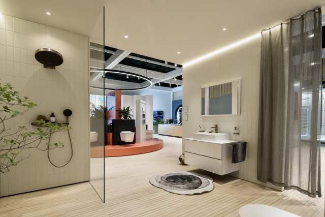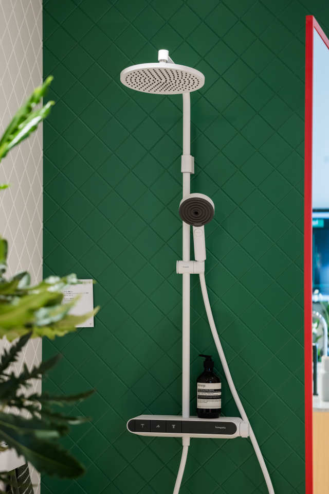 淋浴区全新的明装恒温淋浴系列ShowerTablet Select 360“小欧淋控”被呈现在多巴胺元素展间,搭配超大置物架,兼具年轻人颜控当先、多功能合一、简易操作等元素,诠释明快愉悦的年轻宣言。亮眼的大尺寸花洒,令水滴畅快包裹身体;轻触操作按钮,即可轻松切换出水模式;时尚外表下温控安全锁、恒温阀芯的设计细节,时刻守护用水时的安心自在。小身材,多功能,灵活明装,亲民定位,汉斯格雅为日益年轻化的淋浴需求倾注创新与诚意。